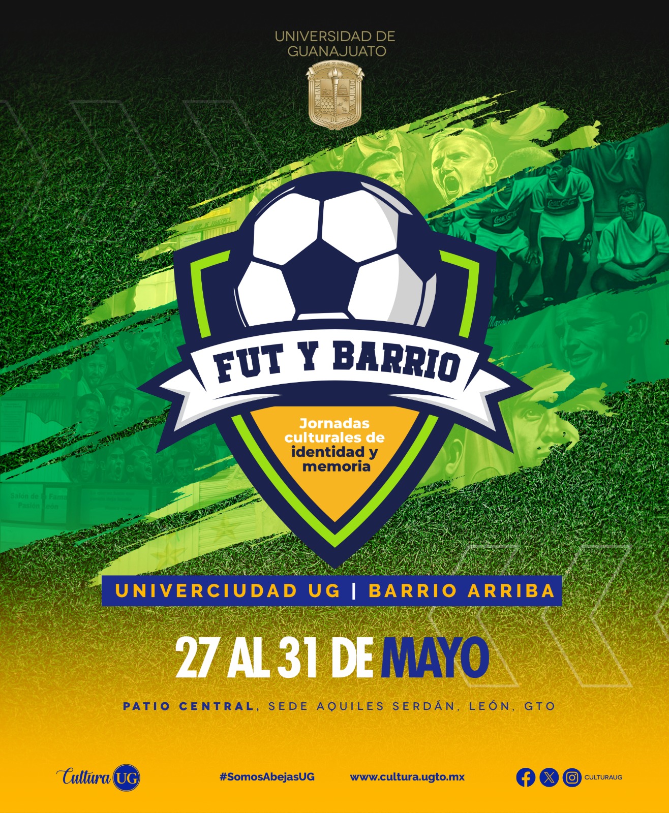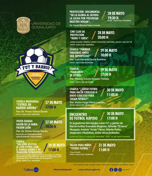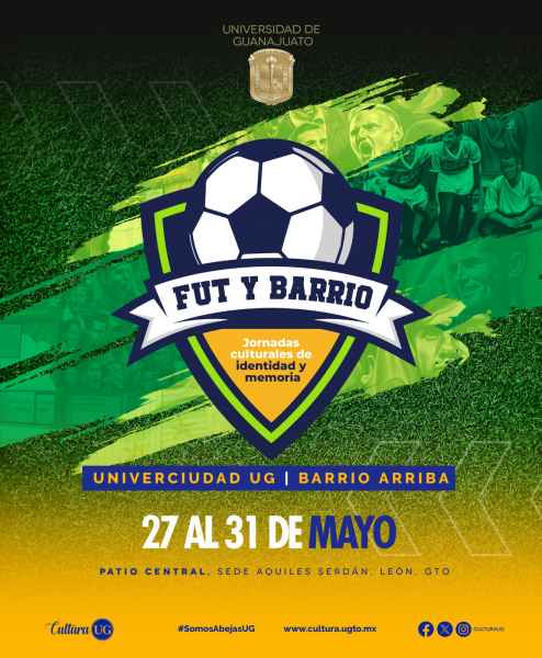 León, Gto., a 23 de mayo de 2024.- Univerciudad UG “Barrio Arriba” León presenta las primeras Jornadas Culturales de Identidad y Memoria “Fut y Barrio”, del 27 al 31 de mayo, con el propósito de mostrar como la riqueza cultural traspasa las aulas universitarias y se suscribe dentro de los saberes comunitarios como es el caso de la zona de Barrio Arriba lugar donde nació el fútbol leonés.