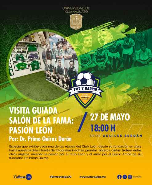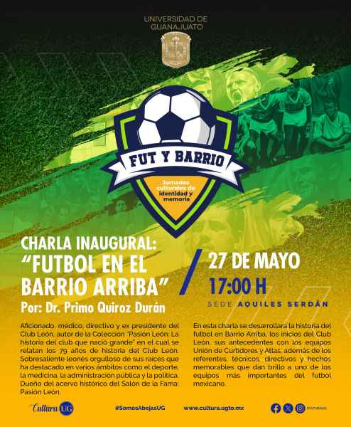 Se tendrá la participación del Dr. Primo Quiroz Durán, autor de la Colección “Pasión León: La historia del club que nació grande”, en el cual se relatan los 79 años de historia del Club León. El Dr. Quiroz acompañará con la charla inaugural el día 27 de mayo a las 17:00 horas en la Sede Aquiles Serdán (calle Aquiles Serdán núm. 924, Col. Obregón), en la cual hablará acerca de la historia y los hechos memorables de este reconocido equipo del fútbol mexicano, y orgullo guanajuatense.