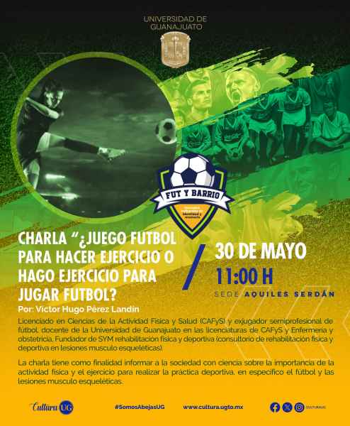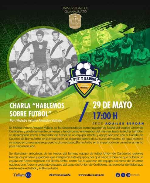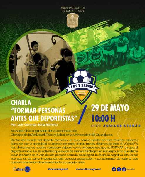 El 29 de mayo se podrá disfrutar de dos charlas exquisitas, la primera “Formar personas antes de deportistas” a las 10:00 horas, por Luis Gerardo Soria Ramírez, activador físico y egresado de la Licenciatura de Ciencias de la Actividad Física y Salud en la Universidad de Guanajuato. La segunda charla versará sobre “Hablemos del fútbol” por el exfutbolista del equipo Unión de Curtidores, Moisés Arturo Amador Vallejo, ambas en la Sede Aquiles Serdán, que será sede de las aristas que atraviesan al fútbol y que en ocasiones se pierden de vista como la relevancia del sentido humanista en el deporte.