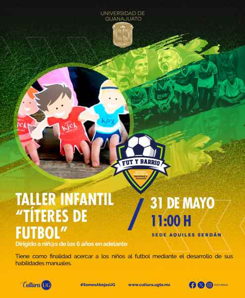 Para finalizar las jornadas deportivas y culturales se tendrá un espacio dedicado a las infancias, para acercarlas al deporte, mediante el desarrollo de sus habilidades motrices y manuales con el taller “Títeres fútbol” que se llevará a cabo en la sede Aquiles Serdán a las 11:00 horas ¡Es cupo limitado!, así que, no tardes en reservar el lugar de tu pequeña abeja.