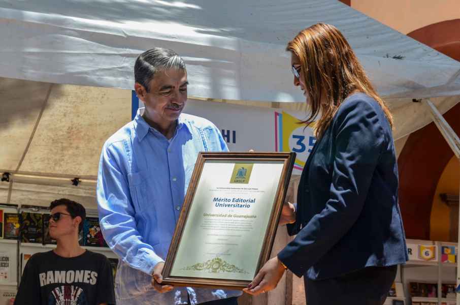 En el desarrollo del acto protocolario, el Rector General de la UASLP, Dr. Alejandro Javier Zermeño Guerra entregó a la Universidad de Guanajuato el reconocimiento al Mérito Editorial Universitario, por posicionarse como una institución de educación pública de nivel superior que ha dedicado un gran esfuerzo a la producción digital de libros de diversos contenidos.