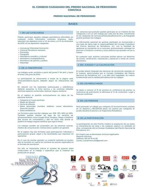 Guanajuato, Gto., 29 de mayo 2024.- El 3 de junio cierra la convocatoria para participar en el Premio Nacional de Periodismo 2023 y no importa el tamaño del medio de comunicación del que formas parte o en qué lugar se encuentre de México, puedes enviar tu trabajo publicado o transmitido del primero de enero al 31 de diciembre de 2023 a la plataforma en www.periodismo.org.mx