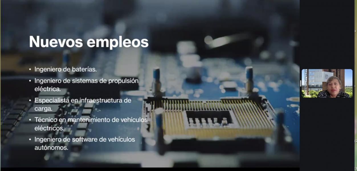 Describió los nuevos empleos que se vislumbran, como ingeniería de sistemas de propulsión eléctrica, ingeniero(a) de baterías, técnico de mantenimiento de vehículos eléctricos, especialistas en reciclaje de baterías, investigadore(a)s de materiales, ingeniería de software de vehículos autónomos, por mencionar algunos ejemplos.