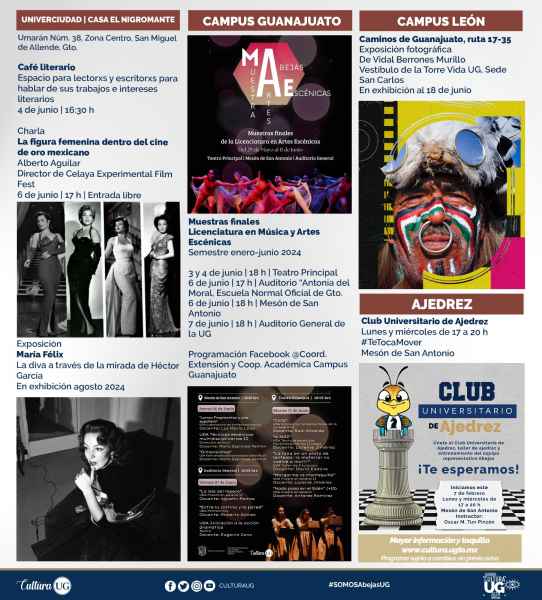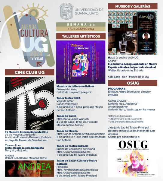 Guanajuato, Gto., a 31 de mayo de 2024.- La Universidad de Guanajuato (UG) ofrece para todo público una cartelera con diversas actividades culturales y artísticas que deleitará todos los sentidos a través de la Agenda Cultural UG (ACUG) en esta semana.
