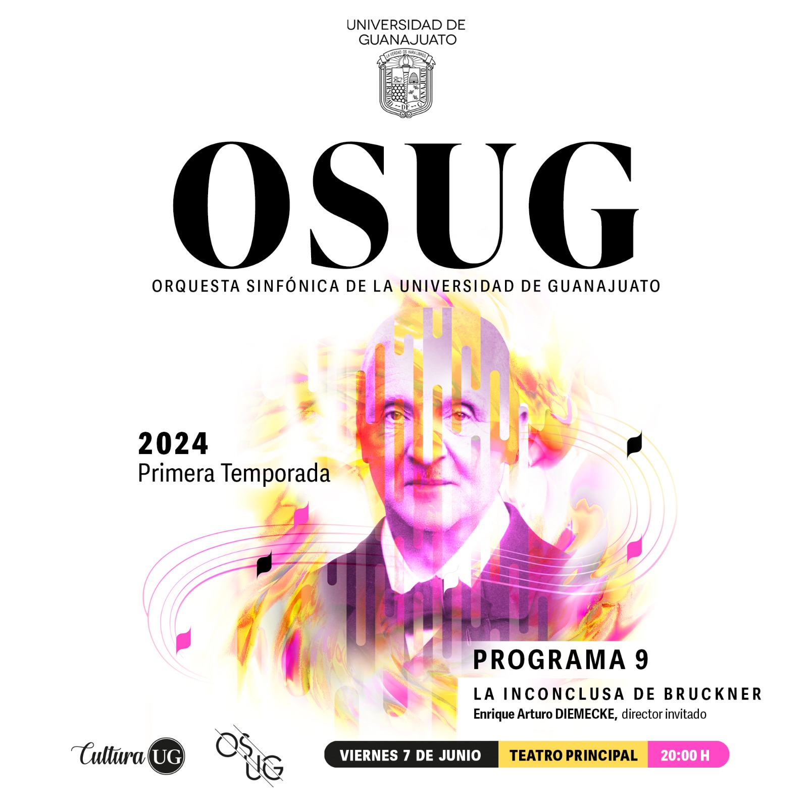 En la música, la Orquesta Sinfónica de la Universidad de Guanajuato,(OSUG) en su programa número 9 tendrá en la batuta al Director invitado Enrique Arturo Diemecke, para armonizar con el estreno en Guanajuato “Sinfonía No.1, Antígona” con el cual se conmemorará el 125 del nacimiento de su autor Carlos Chávez; y la Sinfonía No. 9, WAB 109, en Re menor de Anton Bruckner del cual se cumple 200 aniversario de su nacimiento. La invitación es este 7 de junio a las 20:00 horas en el Teatro Principal; y la charla preconcierto se realizará a las 19:00 horas en la misma sede.