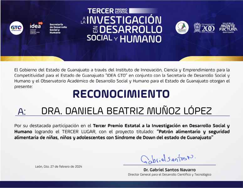 Aunado a lo anterior, la Dra. Muñoz López participó en el Tercer Premio Estatal a la Investigación en Desarrollo Social y Humano. En ese certamen obtuvo el tercer lugar con la investigación “Patrón alimentario y seguridad alimentaria en niñas, niños y adolescentes con Síndrome de Down del estado de Guanajuato”, investigación que se llevó a cabo junto con la egresada en nutrición, Yadira del Rocío Ramos Espinosa y la Dra. María Lola Evia Viscarra.