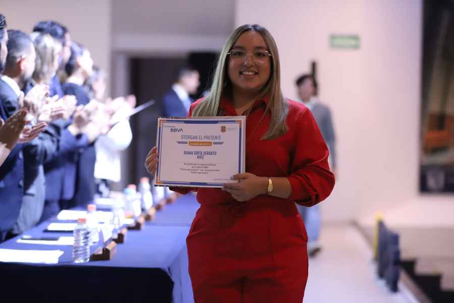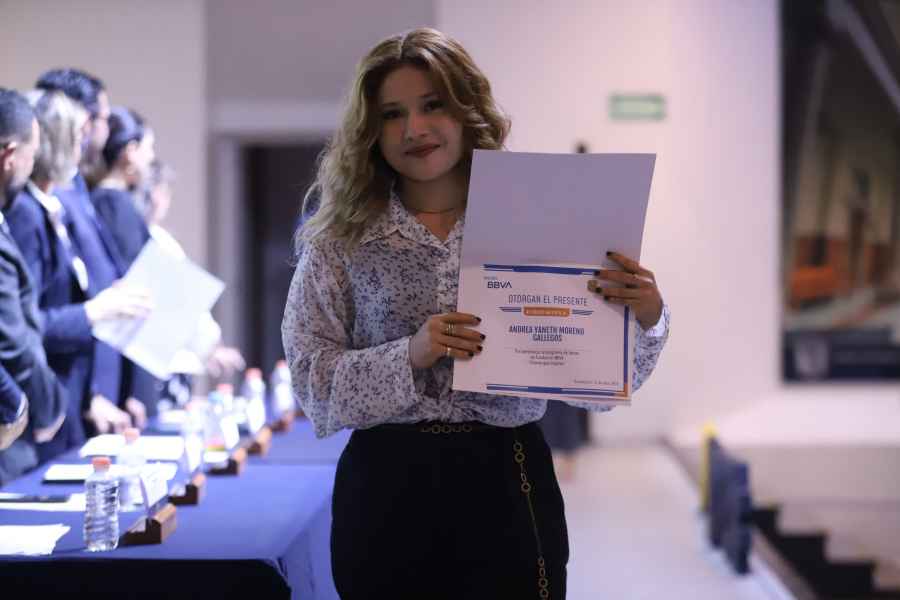 Al hacer uso de la voz en representación de las y los becarios del programa “Chavos que Inspiran”, la estudiante del 6° semestre la Licenciatura en Comercio Internacional UG, Miriam Paulina Calero Granados, sostuvo que: “este fue el inicio de una travesía maravillosa que me ha llevado hasta aquí, ya que la Fundación BBVA ha sido fundamental en mi trayectoria académica, no solo al brindarme ayuda económica sino también cursos de formación que han sido una fuente invaluable de conocimientos y habilidades”, expuso.