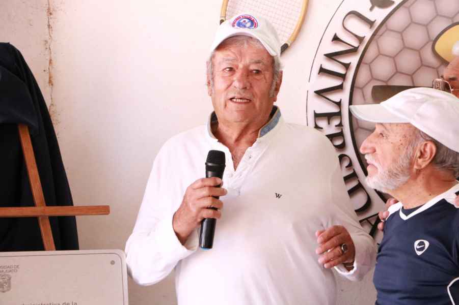 Guanajuato, Gto., a 15 de junio de 2024.- Autoridades universitarias y representantes del Club de Tenis Santa Fe de Guanajuato homenajearon al C. Oscar Urquiza Aguilar por su aportación al deporte de Guanajuato con la develación de una placa en la Unidad Nieto Piña. Lo anterior, en el marco de la edición XXXIX del Torneo de Tenis que se desarrolla en ese espacio universitario.