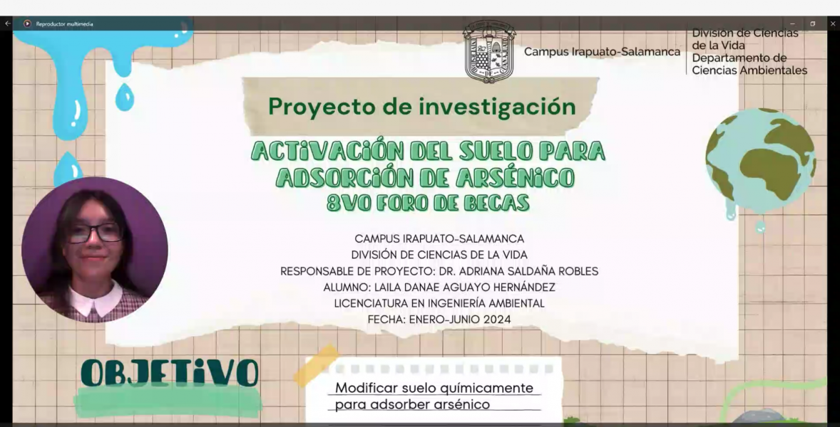 Finalmente, Laila Dánae Aguayo Hernández, alumna de la Licenciatura en Ingeniería Ambiental en la sede Irapuato, compartió su experiencia al participar en el proyecto “Activación del Suelo para Adsorción de Arsénico”, que realizó en apoyo a la Dra. Adriana Saldaña Robles.