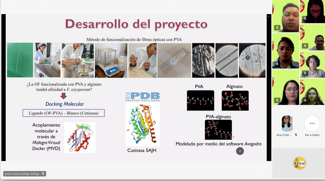 Dulce María Zarazúa Sánchez, alumna de la Licenciatura en Ingeniería en Agronomía en la sede Tierra Blanca, habló del trabajo “Funcionalización de Fibras Ópticas para Detección de Fusarium OxysPorum”, un hongo causante de una de las enfermedades más agresivas para el banano y otras especies vegetales, cuyo responsable fue el Dr. Erik Díaz Cervantes.