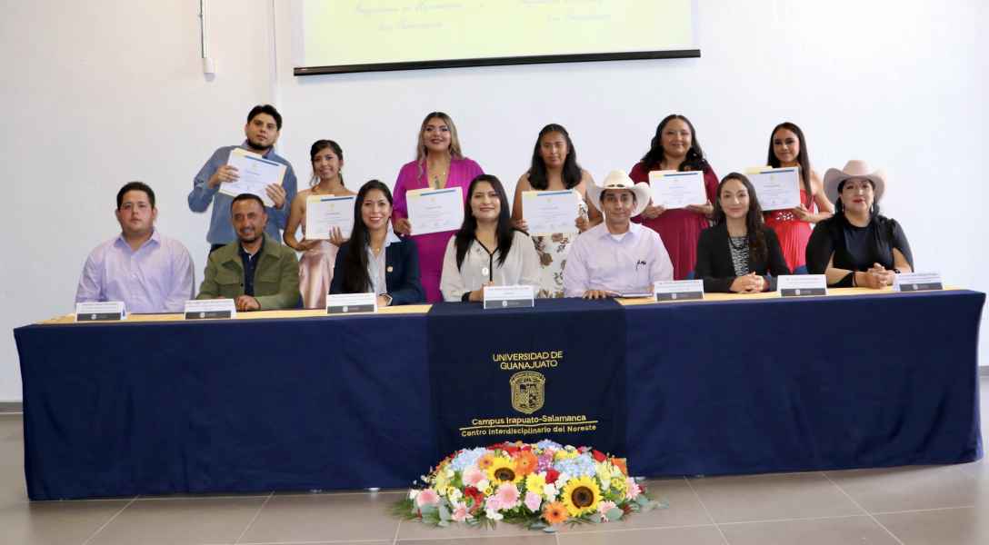 La ceremonia fue presidida por la Dra. Paula Concepción Isiordia Lachica, Secretaria Académica del Campus Irapuato-Salamanca; el Ing. Alfredo Mozqueda Córdova en representación del Dr. Rogelio Costilla Salazar, Director de la División Ciencias de la Vida; la Dra. Lucero Fuentes Ocampo, Coordinadora General del Centro Interdisciplinario del Noreste; la Dra. Ana Isabel Mireles Arriaga, Directora del Departamento de Agronomía, la MC. Ericka Urbiola Rangel, Enlace Académico de Ingenierías en el CINUG; el MGC. Edgar Pedro Méndez Vázquez, Profesor del CINUG y Natanael Chávez Hernández como primer egresado de Energías Renovables.