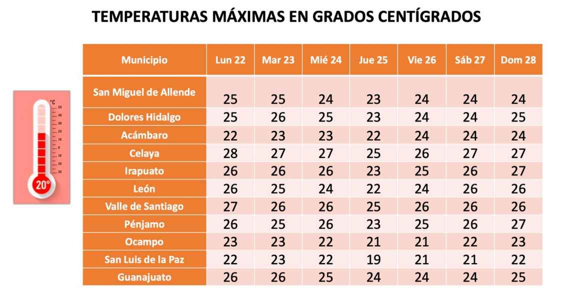 Asimismo, señaló que el aire se mantendrá relativamente templado en el estado de Guanajuato, y se esperan temperaturas máximas de entre los 28 y 29 grados centígrados.
