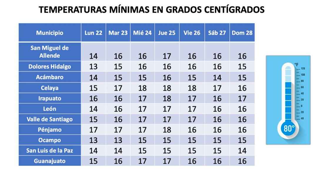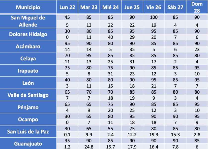 Para conocer a detalle el pronóstico del tiempo para el estado de Guanajuato, se puede consultar el sitio www.acaug.ugto.mx/index.php/sample-sites/prediccion-a-7-dias