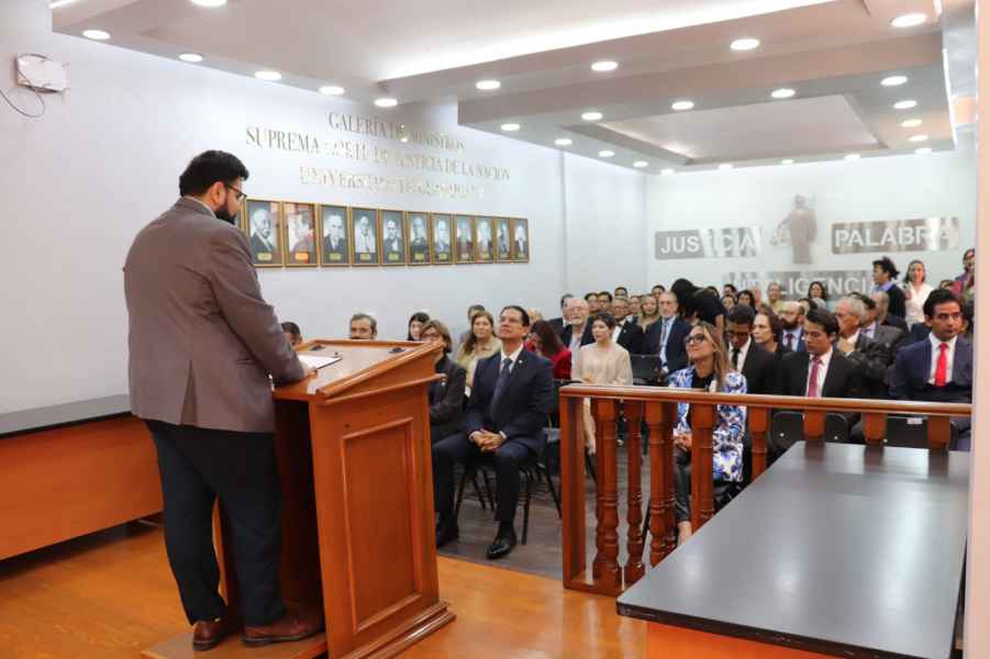 Correspondió al Dr. Eduardo Pérez Alonso, Director de la División de Derecho, Política y Gobierno (DDPG), ofrecer un mensaje inaugural en donde destacó el orgullo por inaugurar un aula para estudiantes, en la cual podrán hacer prácticas en la nueva modalidad de audiencia de oralidad y, a un costado, tener una galería de personajes universitarios egresados del Colegio del Estado y la UG, que han llegado a la Máxima Magistratura del país y, por otro lado, a doctrinistas que se encargan del estudio del Derecho.