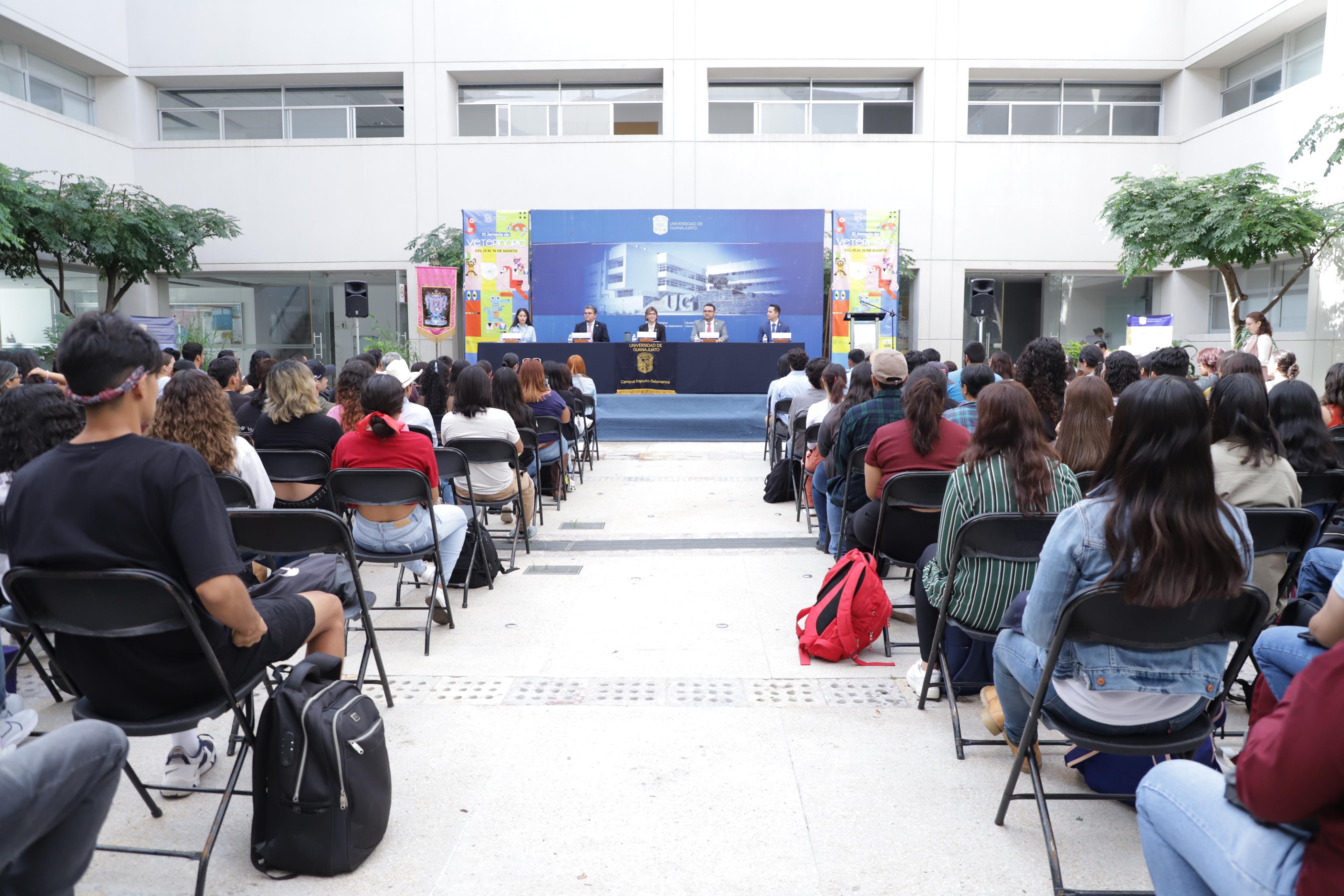 Guanajuato, Gto., a 12 de agosto de 2024.- Con el objetivo de promover el conocimiento de los avances en la investigación relacionada con salud animal, fue inaugurada la XI Jornada de Veterinaria del Programa Educativo de Veterinaria y Zootecnia de la División de Ciencias de la Vida del Campus Irapuato-Salamanca de la Universidad de Guanajuato (UG).