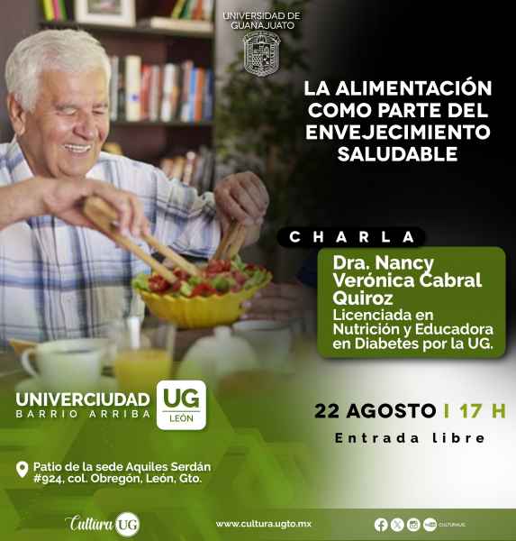 En Univerciudad Barrio Arriba del municipio de León se llevará a cabo la charla “La alimentación como parte del envejecimiento saludable”, impartida por la Dra. Nancy Verónica Cabral Quiroz, el 22 de agosto a las 17:00 horas y en la galería de este mismo foro se expone “A ojo de pájaro”.