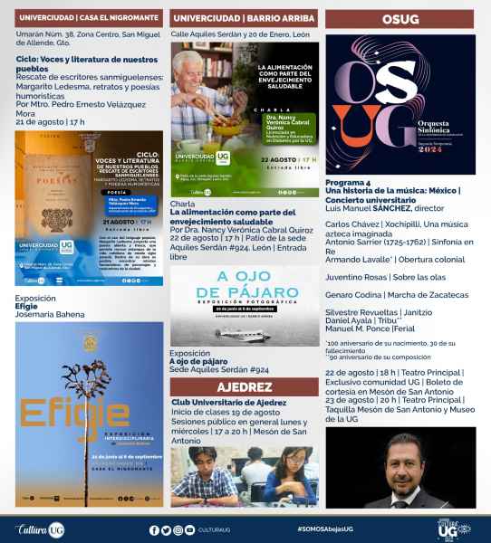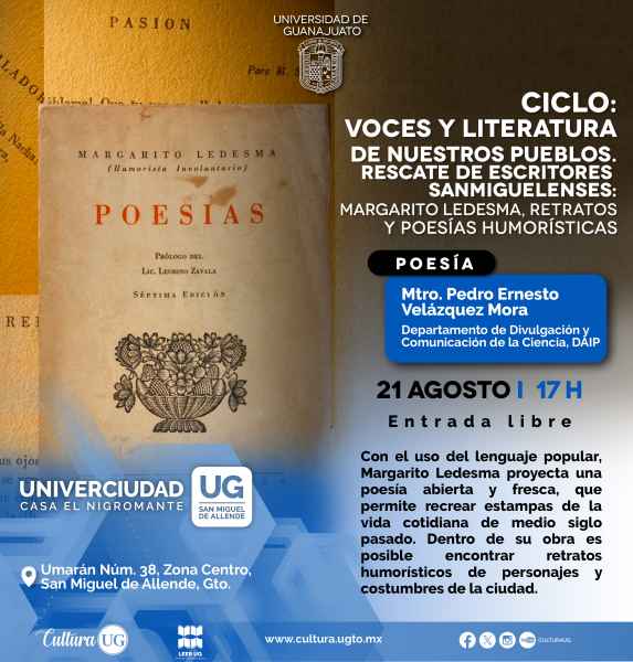 Univerciudad Casa El Nigromante en San Miguel de Allende albergará el Ciclo: Voces y literatura de nuestros pueblos, un rescate de escritores sanmiguelenses como: Margarito Ledesma, retratos y poesías humorísticas el cual será dirigido por el Mtro. Pedro Ernesto Velázquez Mora el 21 de agosto a las 17:00 horas. La exposición “Efigie” de Josemaria Bahena también se podrá visitar hasta el 6 de septiembre.