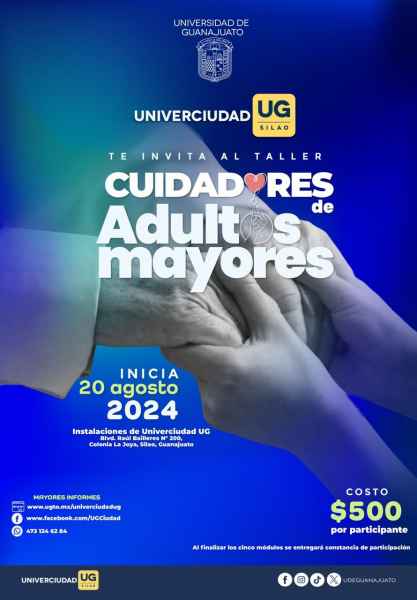 Guanajuato, Gto., a 19 de agosto de 2024.- Con el objetivo de impulsar el cuidado a personas adultas mayores y a las infancias, Univerciudad Silao, ofrece los días 16, 20 y 21 de agosto dos talleres y una conferencia.