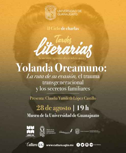 El II Ciclo de charlas y tardes literarias también se hace presente en el MUG el 28 de agosto a las 19:00 horas, en las que participa Claudia Yamileth López con el tema “Castillo Yolanda Oreamuno: La ruta de su evasión, el trauma transgeneracional y los secretos familiares”.