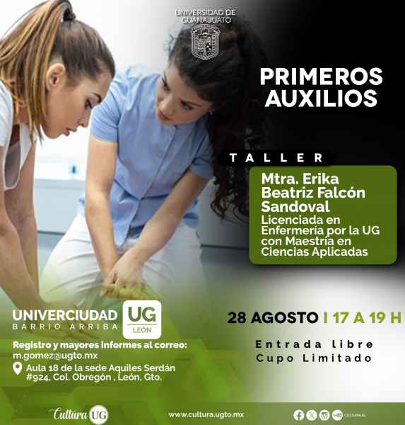 En Univerciudad Barrio Arriba, en León, se ofrecerá el taller de primeros auxilios impartido por la Mtra. Erika Beatriz Falcón Sandoval el 28 de agosto a las 17:00 horas con una entrada libre. En esta misma sede también se encuentra en exhibición “A ojo de pájaro”.