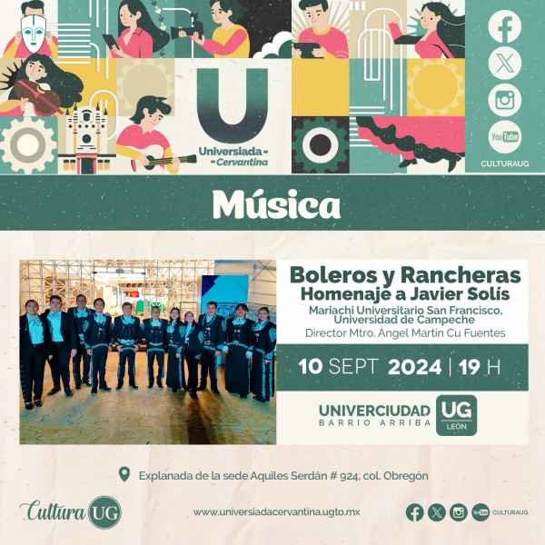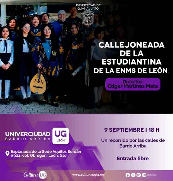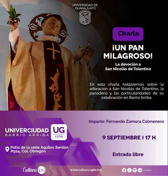 En Univerciudad Barrio Arriba, León, este 9 de septiembre: se impartirá la charla ¡Un pan milagroso! La devoción a San Nicolás de Tolentino en Barrio Arriba por Fernando Zamora Colmenero a las 17:00 horas. También, se llevará a cabo la Callejoneada de la Escuela del Nivel Medio Superior de León, bajo la dirección de Edgar Martínez Mata, a las 18 horas, además los boleros y rancheras en homenaje a Javier Solís del Mariachi se presentan el 10 de septiembre a las 18:00 horas.