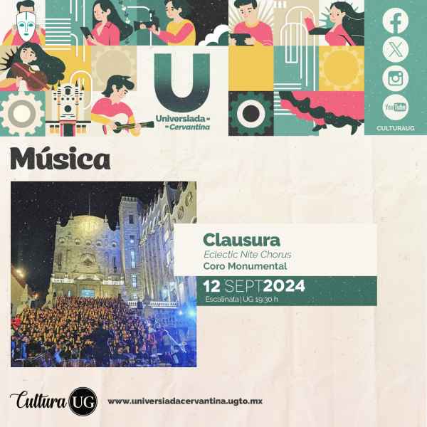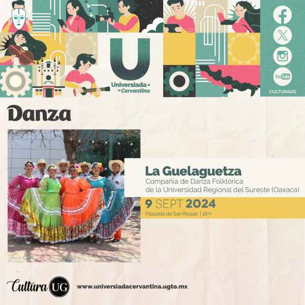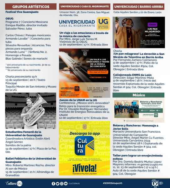 Para el 14 de septiembre a las 17:00 horas la Estudiantina Femenil de la UG dará muestra de su talento en la Plaza de la Paz con el programa Sonidos de la patria. El folclor no puede faltar, ya que el Ballet Folklórico de la UG (BAFUG) presentará “Al son de México” bajo la dirección del Mtro. Roberto Martínez Rocha, el 15 de septiembre a las 21:00 horas en la Alhóndiga de Granaditas.