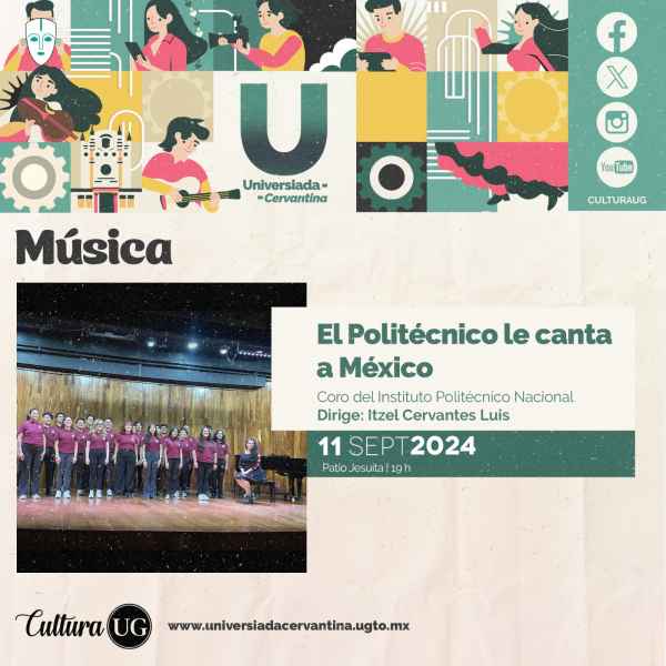 El Politécnico le canta a México con el Coro del Instituto Politécnico Nacional dirigido por Itzel Cervantes Luis, el 11 de septiembre a las 19:00 horas en el Patio Jesuita. Para el 12 de septiembre a las 19:30 horas en las Escalinata de la UG se presenta ClausuraEclectic Nite Chorus intepretado por el Coro Monumental.