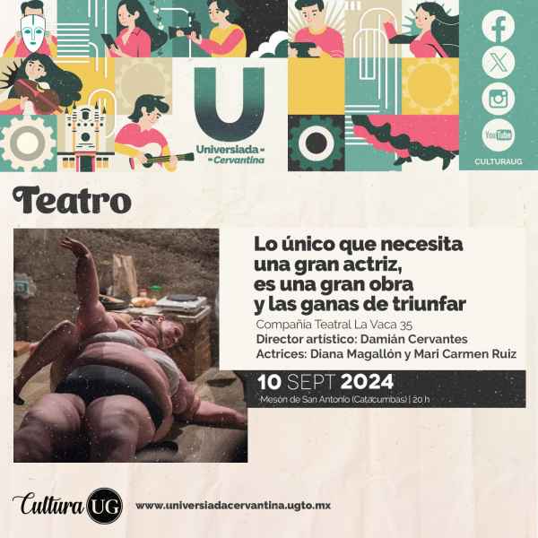 Bajo el título “Lo único que necesita una gran actriz, es una gran obra y las ganas de triunfar” se presenta la Compañía Teatral La Vaca 35 del director artístico, Damián Cervantes, y como actrices Diana Magallón y Mari Carmen Ruiz, quienes se presentarán el 10 de septiembre a las 20:00 horas en el Mesón de San Antonio