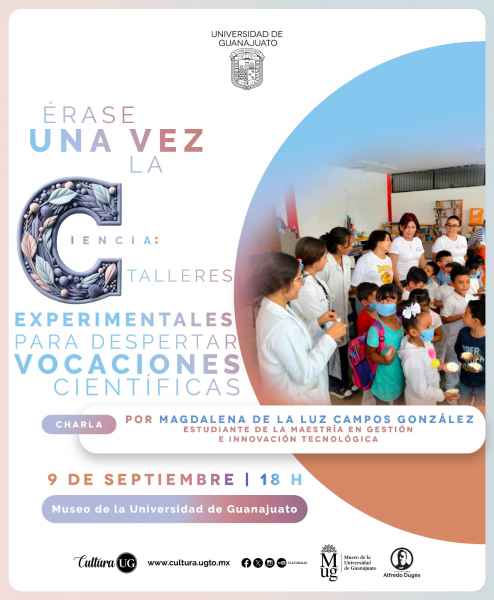 En el Museo UG se hace presente: “Érase una vez la Ciencia: Talleres Experimentales para despertar vocaciones científicas” impartida por Magdalena de la Luz Campos González, Estudiante de la Maestría en Gestión e Innovación Tecnológica este 9 de septiembre a las 18:00 horas, y dentro del II Ciclo de charlas en “Tardes literarias” se presenta Kyn Taniya. Un cosmopolita radical impartido por Anuar Jalife Jacobo el 11 de septiembre a las 19:00 horas.
