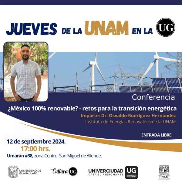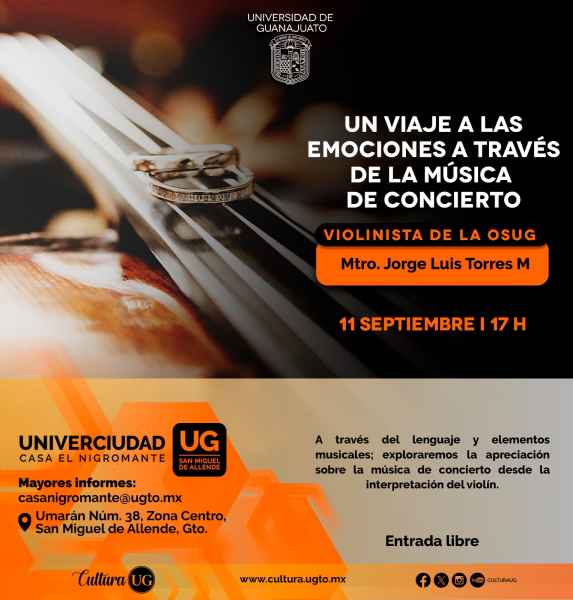 En Univerciudad, Casa el Nigromante de San Miguel de Allende, se tendrá: la presencia del Violinista de la OSUG el Mtro. Jorge Luis Torres M, quien interpretará “Un viaje a las emociones a través de la música de concierto” el 11 de septiembre a las 17:00 horas. Además, El Jueves de la UNAM se ofrecerá la conferencia: ¿México 100% renovable? Retos para la transición energética impartida por el Dr. Osvaldo Rodríguez Hernández, del Instituto de Energías Renovables de la UNAM, el 12 de septiembre a las 17:00 horas con una entrada libre.
