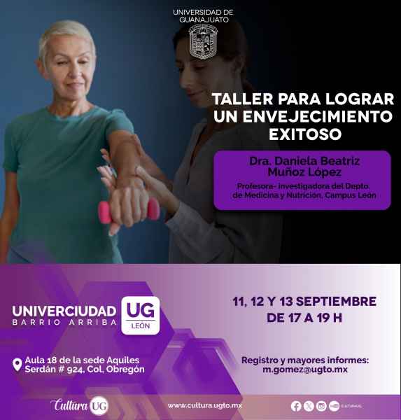 Finalmente, el taller para lograr un envejecimiento exitoso se llevará a cabo los días 11, 12, 13 de septiembre de 17:00 a 19:00 horas en el aula 18 de la sede Aquiles Serdán, impartido por la Dra. Daniela Beatriz Muñoz López.