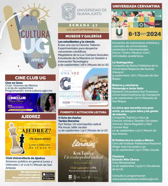 Cine en línea con su ciclo “Visiones de México” continuará sus transmisiones hasta el 29 de septiembre a través de www.cultura.ugto.mx. Mientras que el club universitario de ajedrez de la UG sigue presente en el Mesón de San Antonio los lunes y miércoles de 17:00 a 20:00 horas.