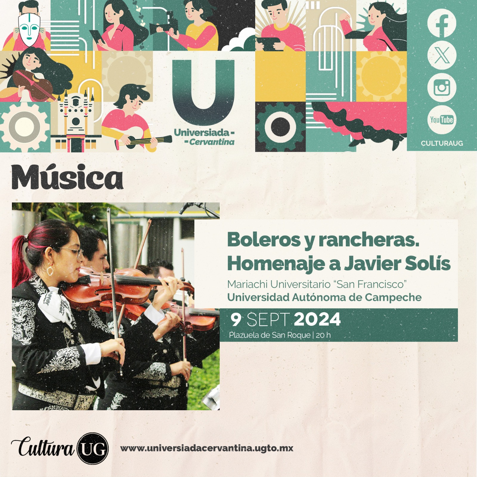 Para el nueve de septiembre en la Plazuela de San Roque se presentarán: la “Guelaguetza” con la Compañía de Danza Folklórica de la Universidad Regional del Sureste (Oaxaca) en punto de las 18:00 horas, y las 20:00 horas los boleros y rancheras en homenaje a Javier Solís serán interpretados por el Mariachi Universitario San Francisco de la Universidad Autónoma de Campeche.