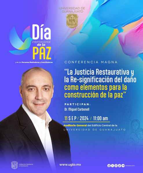 Guanajuato, Gto., a 09 de septiembre de 2024.- La Universidad de Guanajuato, a través de su Unidad de Mediación y Conciliación, invita a la comunidad universitaria y público en general a formar parte de las actividades que conmemorarán el Día Internacional de la Paz, a desarrollarse el próximo miércoles 11 de septiembre del año en curso, a partir de las 11:00 horas en el Auditorio General del Edificio Central UG.