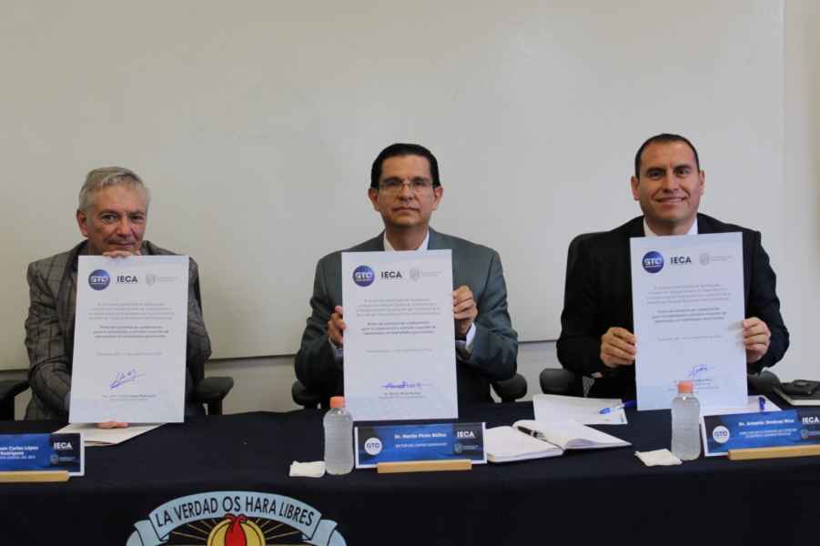 Testimoniaron la firma del convenio, la Dra. Laura Elena Zárate Negrete, Secretaria Académica de la DCEA; el Ing. Juan Carlos Camacho Gómez, Director Técnico Académico de IECA y el Mtro. Cristóbal García Estévez, Director de Vinculación y Comunicación del IECA.