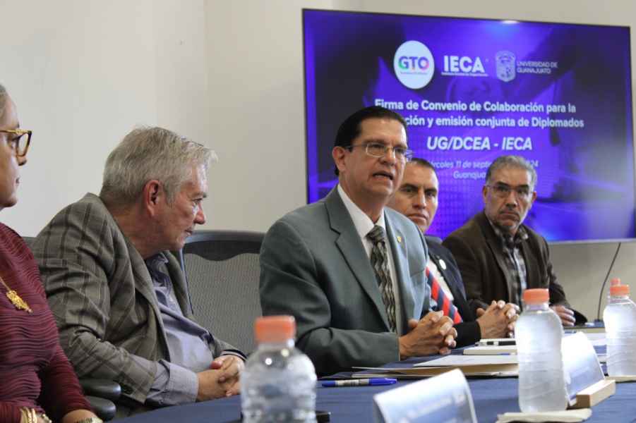 Guanajuato, Gto., a 13 de septiembre de 2024.- La División de Ciencias Económico Administrativas (DCEA) del Campus Guanajuato de la Universidad de Guanajuato (UG), signó un convenio de colaboración con el Instituto Estatal de Capacitación (IECA), para la elaboración y emisión conjunta de Diplomados en Habilidades Gerenciales.