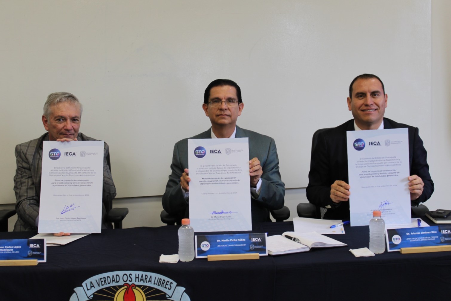 Firmaron el documento el Dr. Martín Picón Núñez, Rector del Campus Guanajuato de la UG, el Ing. Juan Carlos López Rodríguez, Director General del Instituto Estatal de Capacitación (IECA) y el Dr. Artemio Jiménez Rico, Director de la División de Ciencias Económico Administrativas (DCEA).