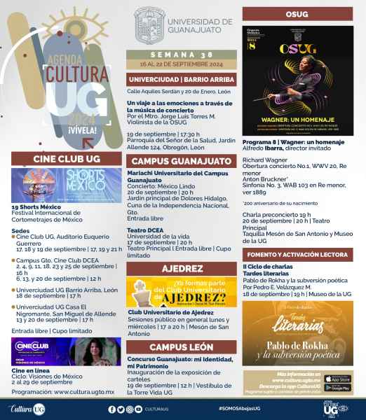 Se puede consultar más información en www.cultura.ugto.mx, también se puede descargar la app CulturaUG. Este programa está sujeto a cambios sin previo aviso.
