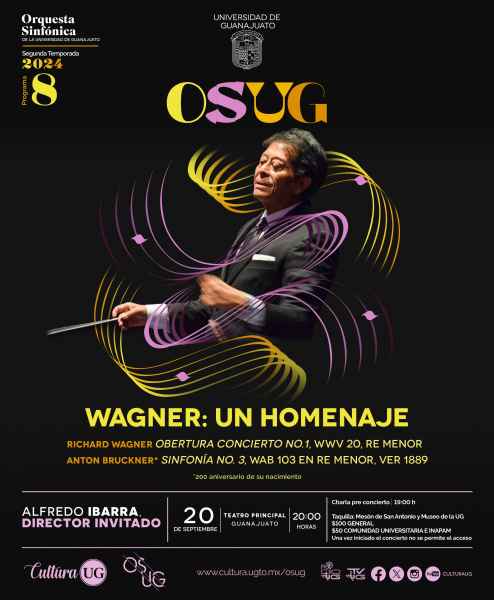 En música clásica, la Orquesta Sinfónica de la Universidad de Guanajuato (OSUG) presenta su Programa 8 “Wagner: un homenaje” con Alfredo Ibarra, como director invitado. El programa presenta Obertura concierto No.1, WWV 20, Re menor, y Sinfonía No. 3, WAB 103 en Re menor, ver 1889. La cita es el viernes 20 de septiembre en el Teatro Principal a las 20:00 horas. Con charla preconcierto a las 19:00 horas. Taquilla Mesón de San Antonio y Museo de la UG.