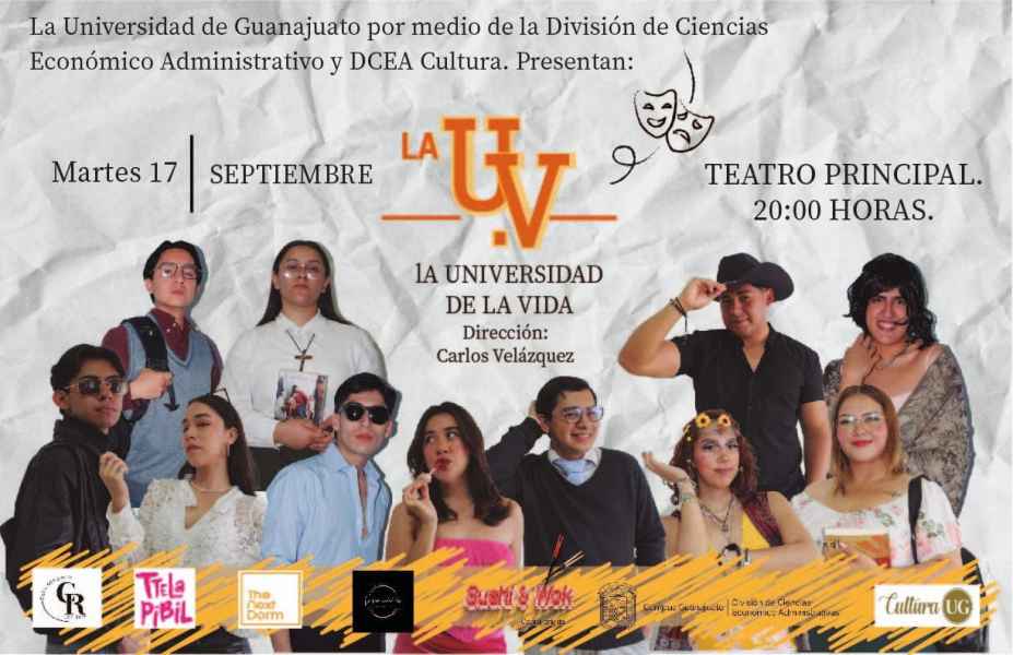 En otras actividades de la comunidad universitaria, el Teatro DCEA presenta “Universidad de la vida” el 17 de septiembre a las 20:00 horas en el Teatro Principal. Entrada libre.