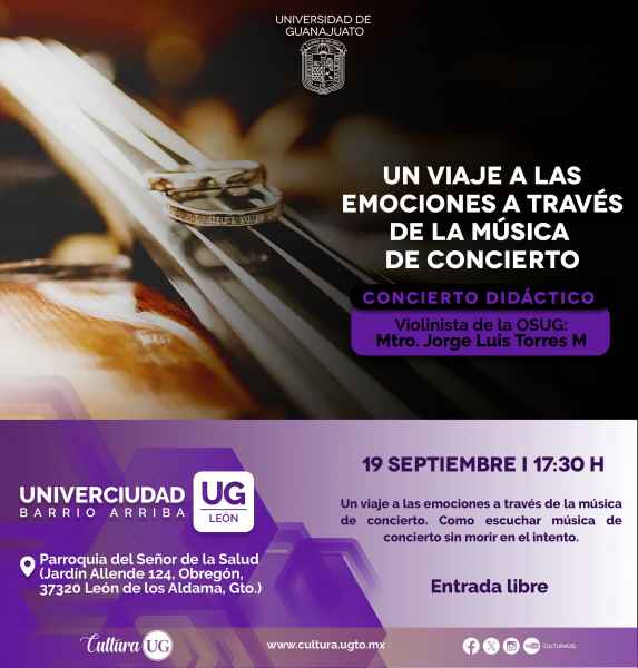 Univerciudad Barrio Arriba León presenta “Un viaje a las emociones a través de la música de concierto” por el Mtro. Jorge Luis Torres M., Violinista de la OSUG, el concierto didáctico se presenta el 19 de septiembre en punto de las 17:30 horas en la Parroquia del Señor de la Salud, Jardín Allende 124, Colonia Obregón.