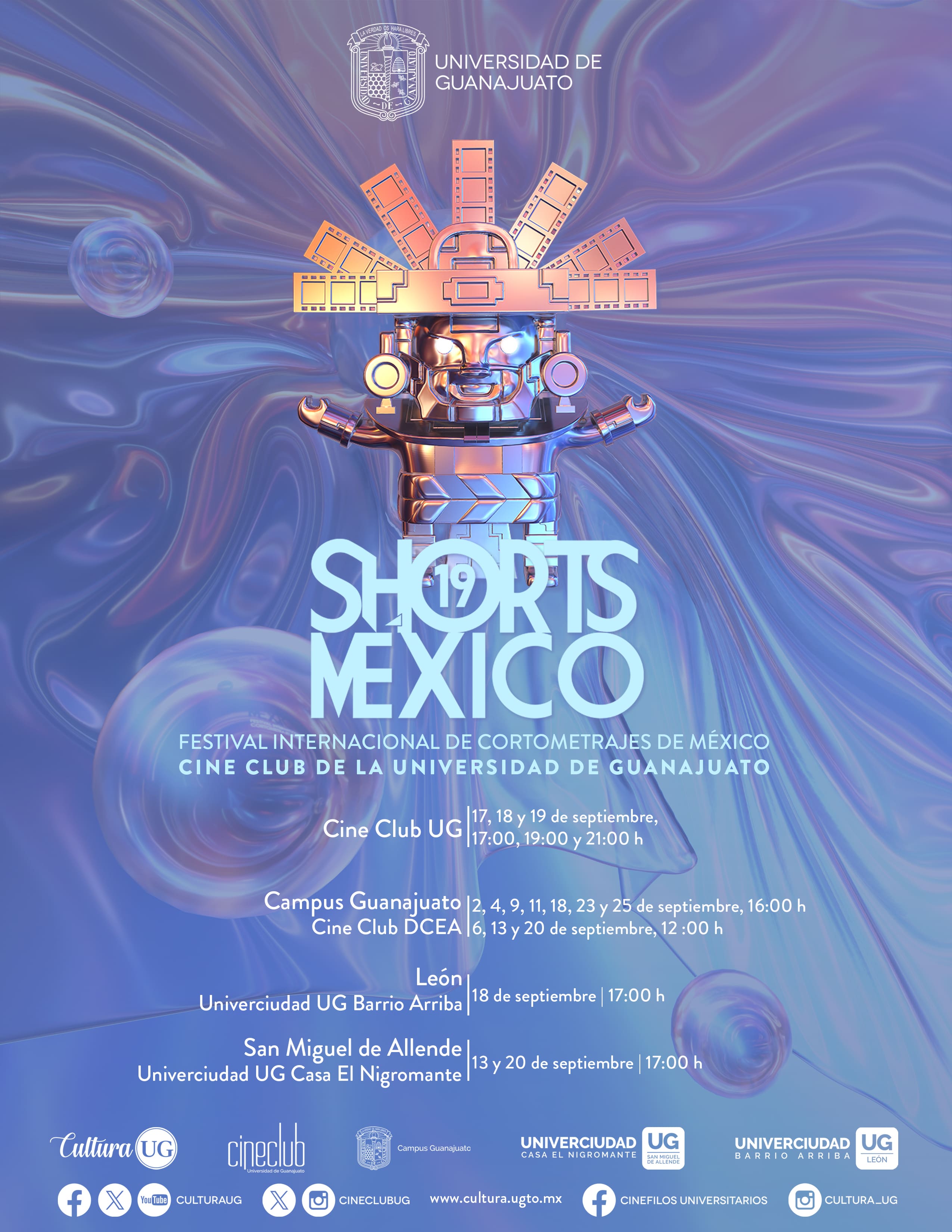 Guanajuato, Gto., a 13 de septiembre de 2024.- Con música, teatro, cine y más, la agenda cultural de la Universidad de Guanajuato presenta “19 Shorts México” Festival Internacional de Cortometrajes de México, como parte del Cine Club UG, con entrada libre las personas podrán asistir a diversas sedes de la Universidad para disfrutar de las muestras cinematográficas.