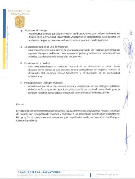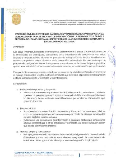 Una vez notificadas las candidaturas, la comunidad universitaria podrá consultar los currículums de la y los candidatos, así como sus proyectos de desarrollo en el sitio www.ugto.mx/campuscelayasalvatierra/procesorectoria2024. Asimismo, del 25 de septiembre al 03 de octubre de 2024, se realizará el procedimiento de consulta de la opinión de la comunidad universitaria, en el que estudiantes, personal académico, administrativo y de servicios del Campus Celaya-Salvatierra podrá expresar su opinión sobre la y los candidatos.