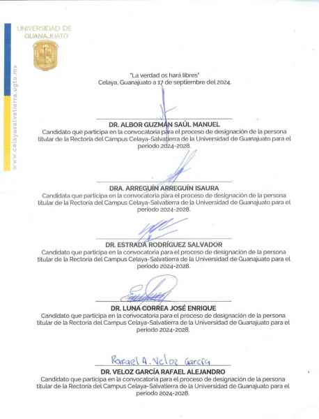 Celaya, Gto., a 17 de septiembre de 2024.- El pleno del Consejo Universitario del Campus Celaya-Salvatierra aprobó las candidaturas de las personas aspirantes registradas que participarán en las siguientes etapas del proceso para la designación de la Autoridad Ejecutiva, Titular de Rectoría del Campus Celaya – Salvatierra de la Universidad de Guanajuato, para el periodo 2024-2028.