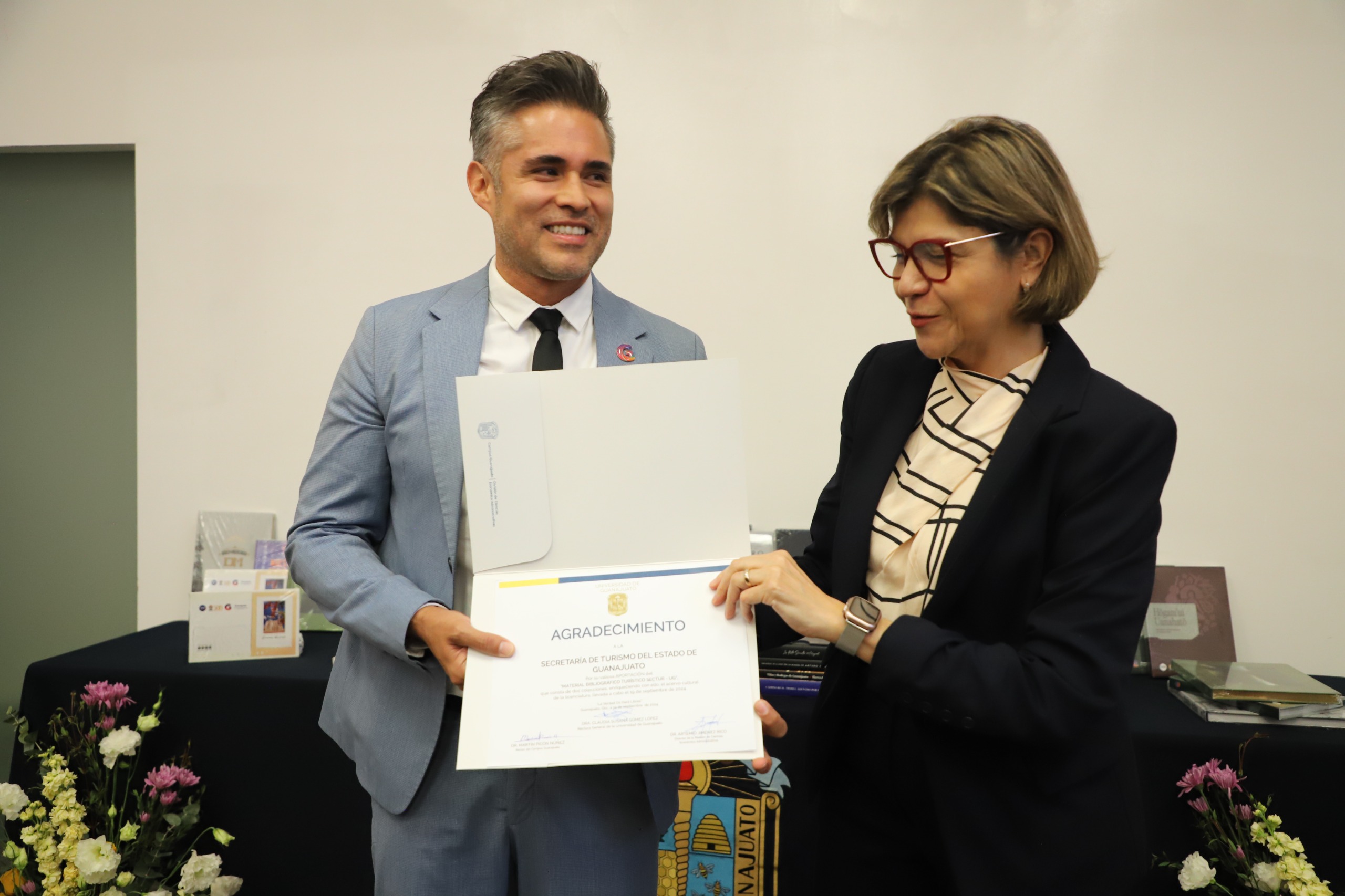 Así, la estudiante Claudia Alejandra Solís López, representante de la comunidad de la carrera de Administración de Recursos Turísticos, entregó un reconocimiento en agradecimiento por la donación de la Secretaría de Turismo del Estado de Guanajuato.