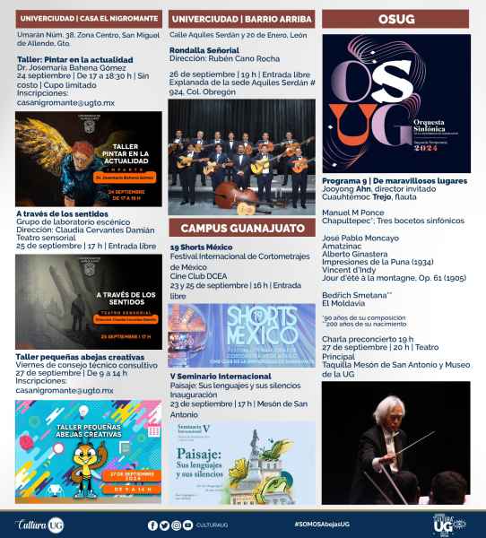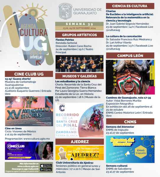 Guanajuato, Gto., a 20 de septiembre de 2024.- Del 23 al 29 de septiembre, la agenda cultural de la Universidad de Guanajuato (UG) continúa las celebraciones patrias con música, cine guanajuatense y mexicano, arte gráfico y reflexiones sobre los paisajes.