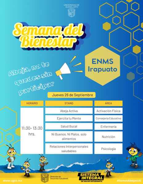 Las Escuelas de Nivel Medio Superior (ENMS) de la UG se suman a esta agenda con dos actividades. Del 23 al 27 de septiembre, la ENMS Irapuato tendrá su “Semana del bienestar” y, en la misma fecha, la ENMS Salvatierra celebrará su “Semana cultural”.