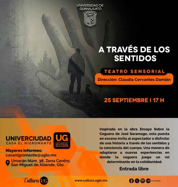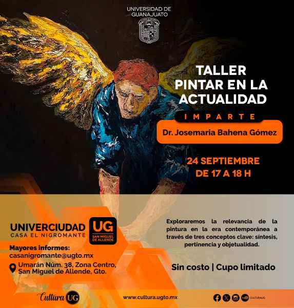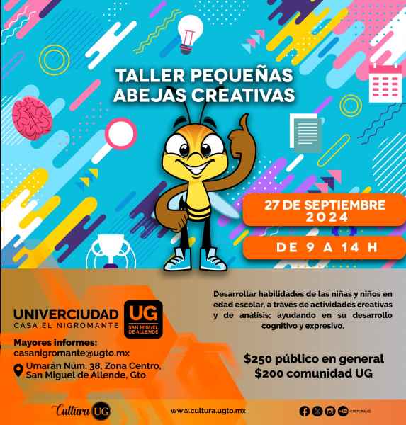 niverciudad UG Casa El Nigromante, en San Miguel de Allende, ofrecerá una obra de teatro y dos talleres. Primero, el taller “Pintar en la actualidad”, a cargo del Dr. Josemaria Bahena Gómez con cupo gratuito y limitado, se desarrollará el 24 de septiembre, de 17 a 18:30 horas. Después, A través de los sentidos, puesta en escena del Grupo de laboratorio escénico, dirigido por Claudia Cervantes Damián, contará con entrada libre el 25 de septiembre a las 17 horas. Por último, “Pequeñas abejas creativas” será una excelente oportunidad para las y los niños durante la mañana del viernes de Consejo Técnico escolar el 27 de septiembre, de 9 a 14 horas. Las inscripciones pueden realizarse vía correo electrónico en Esta dirección de correo electrónico está protegida contra spambots. Usted necesita tener Javascript activado para poder verla..