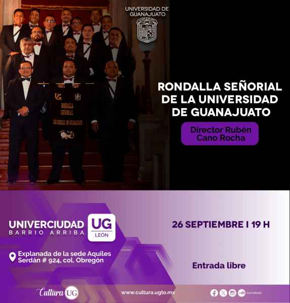 La Rondalla Señorial extenderá la celebración musical en el Teatro Principal con su programa “Fiestas patrias”, el martes 24 de septiembre a las 19 horas, con la dirección de Rubén Cano Rocha, y el jueves 26 de septiembre se presentará en la explanada de la sede Aquiles Serdán 924 en la Univerciudad UG Barrio Arriba, en León.