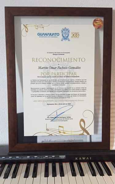 Recientemente, dentro del Proyecto de Estímulos a la Creación para Banda de Viento Tradicional, fue Ganador del Premio “Isaías Barrón” 2024 por su composición titulada El Vals del Quijote, en la categoría jóvenes creadores, la cual se estrenó en el Centro de las Artes de Guanajuato. Asimismo, participó en el proceso de selección del nuevo Himno Estatal. “Esta sensación de pensar en la calidad y cantidad de músicos, compositores y compositoras que iban a participar resultaba intimidante, pero una de las lecciones que más me daba mi maestro de composición era ‘tú aviéntate, echa muchas monedas al aire, alguna va a caer’”, relató.